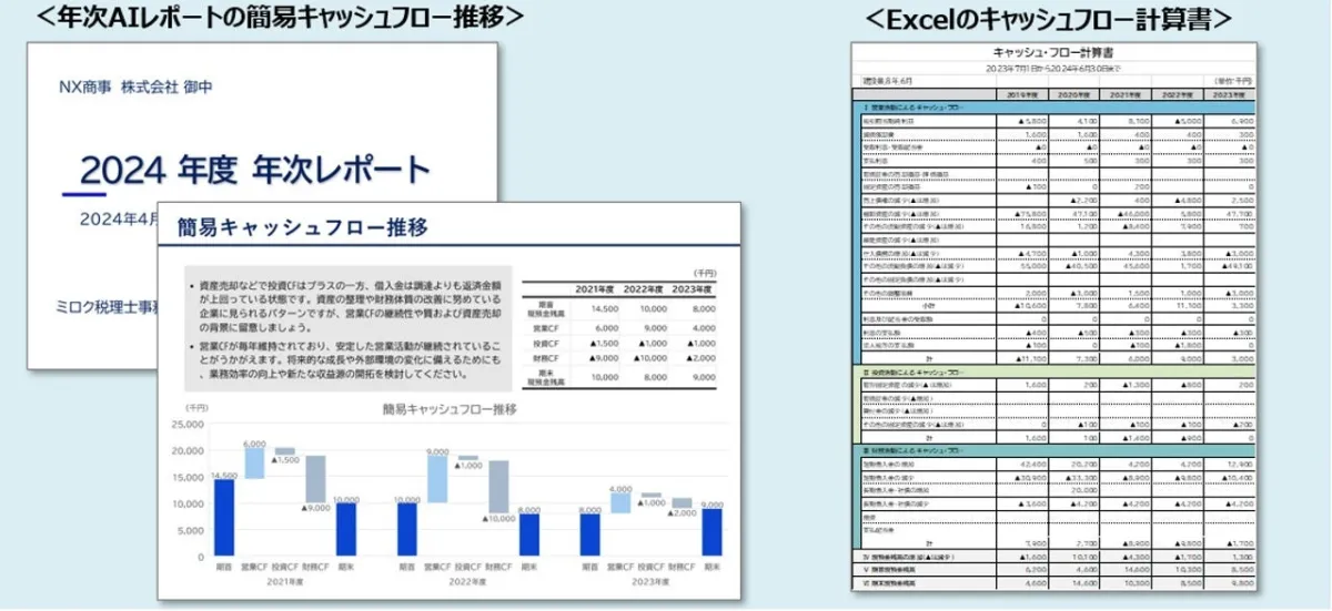 新しく搭載された「AIレポート」機能では、会計データと公的統計を基に生成AIが分析を行い、グラフを含むレポートをボタン一つで出力できます。この機能により、ユーザーは顧問先の会計データをアップロードするだけで、「年次AIレポート」「月次AIレポート」が自動的に作成できるのです。特に注目すべきは、決算確定後の最大5期分のデータを用いた簡易キャッシュフロー計算書の自動作成機能です。これにより、ExcelやPower Point形式での資料作成も可能になり、報告資料作成が加速します。