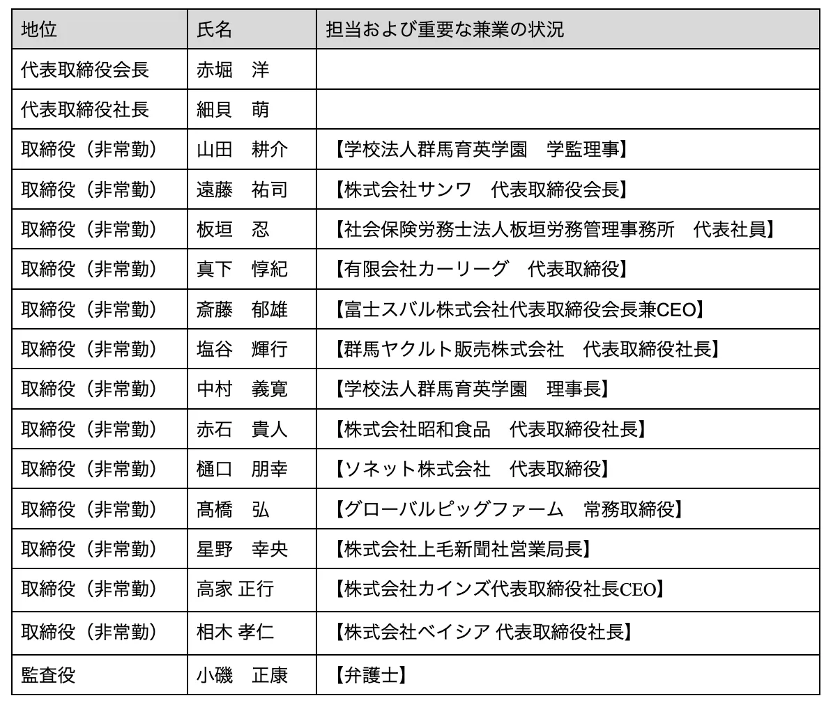 新任取締役陣の詳細はまだ正式発表されていませんが、経営陣の強化が期待されています。特に、代表取締役社長兼GMに就任した細貝萌氏、取締役に就任した高家正行氏(株式会社カインズ代表)および相木孝仁氏(株式会社ベイシア代表)が注目されます。