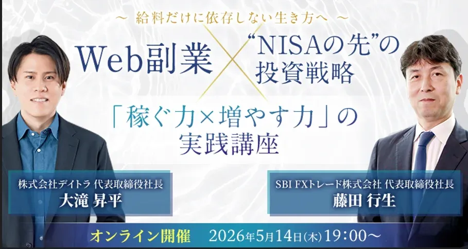 2026年5月14日(木)、SBI FXトレード株式会社と株式会社デイトラの共催によるウェビナー「【給料だけに依存しない生き方へ】Web副業×'NISAの先'の投資戦略」が開催される。このイベントは、リモートで参加可能なオンライン形式で行われ、参加費は無料だ。