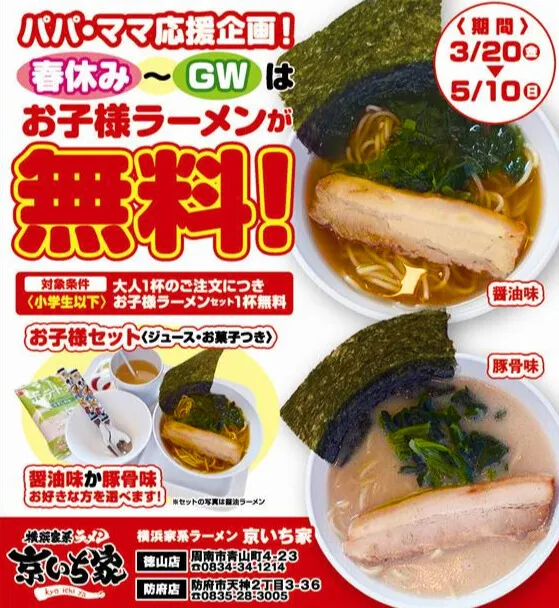横浜家系ラーメン「京いち家」は、地域に寄り添ったイベントとして家族の笑顔を増やす取り組みを実現しています。この春休み及びゴールデンウィーク、多くのご家族が楽しむことができるこの機会を逃す手はありません!