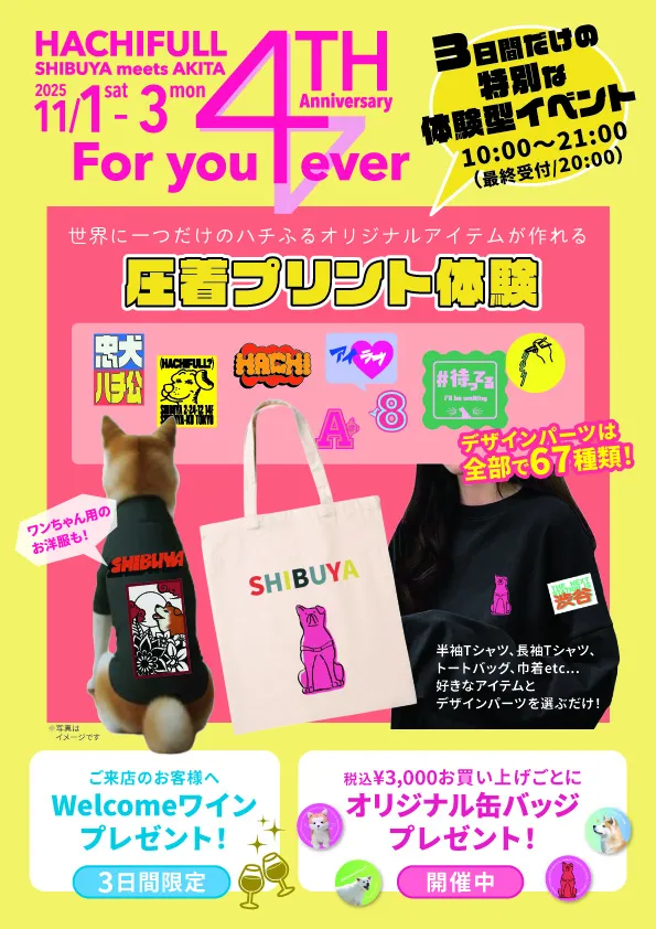 渋谷の「ハチふるSHIBUYA meets AKITA」が、2025年11月1日に4周年を迎える。この特別な日を記念して、11月1日から3日にかけて「ハチふる4周年アニバーサリーイベント-For you 4ever-」が開催される。このイベントのテーマには、「4周年」の数字と、「For(~のために)」、「Forever(永遠に)」が組み合わされており、訪れるすべてのお客様への感謝の気持ちと、これからも愛され続けたいという願いが込められている。