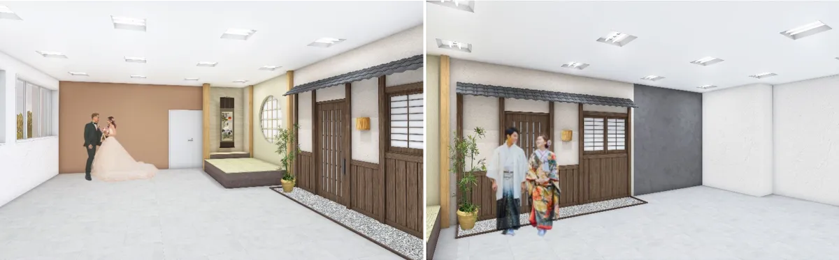 新フォトスタジオでは、シンプルでありながらドレスやタキシードの美しさを引き立てる背景や和風の背景を含む、10種類以上の撮影オプションが用意されています。和風の背景では、挙式の前撮りにぴったりな小上がりの畳や床の間を再現。また、京都の町家の雰囲気を感じさせる背景も完備。さらに、純白のチャペル「札幌ブランバーチ・チャペル」も併設されているため、セレモニー風の特別な撮影にも対応できます。