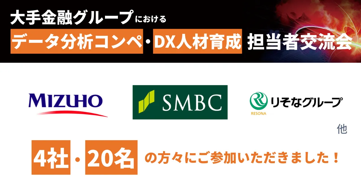 2025年5月19日、株式会社SIGNATEが企画した『大手金融グループにおけるデータサイエンスコンペティションとデータ活用人材育成に関する情報交換会』が東京で開催されました。本交流会には、みずほフィナンシャルグループや三井住友フィナンシャルグループなど、日本を代表する金融グループの20名が参加し、データ活用人材育成の実情について意見を交わしました。
