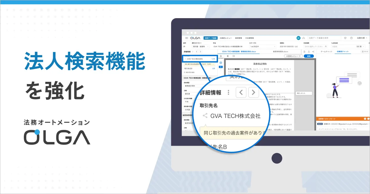 GVA TECH株式会社は、法務オートメーション「OLGA」の法人検索機能を改良したと発表しました。この機能強化により、取引先が社名変更を行った場合でも、新旧の社名を問わず関連する案件をスムーズに検索できるようになります。これにより、案件管理の効率が飛躍的に向上しました。