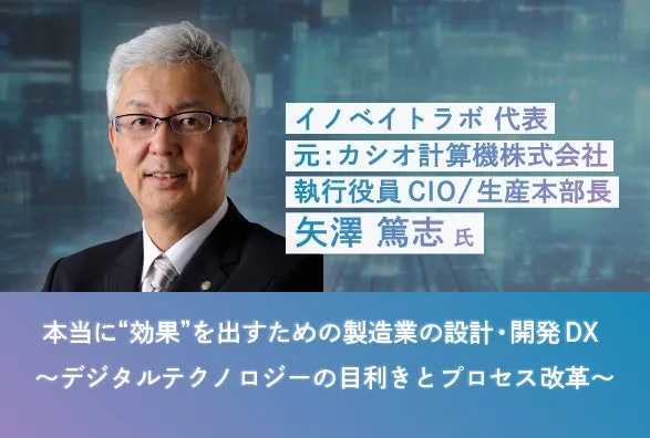 本セミナーでは、製造業の改革成功の秘訣について、特に設計と開発の領域に焦点を当てています。講演を行うのは、元カシオ計算機のCIOで現在はイノベイトラボの代表を務める矢澤篤志氏です。彼は、長年の経験をもとに、実際の改革においてどのように投資対効果を生み出すかについて具体的な事例を交えながら解説します。