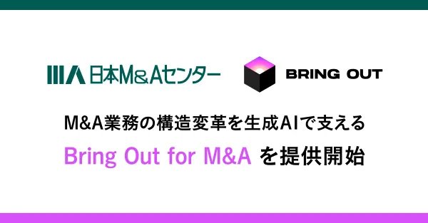 2023年10月、株式会社日本M&Aセンターと株式会社ブリングアウトが共同で開発した、新たなM&A業務支援サービス『Bring Out for M&A(β版)』の運用を開始しました。このサービスは、生成AI技術を活用し、M&Aプロセスにおける対話データの解析を通じて、より高次元なコンサルティングを実現することを目的としています。