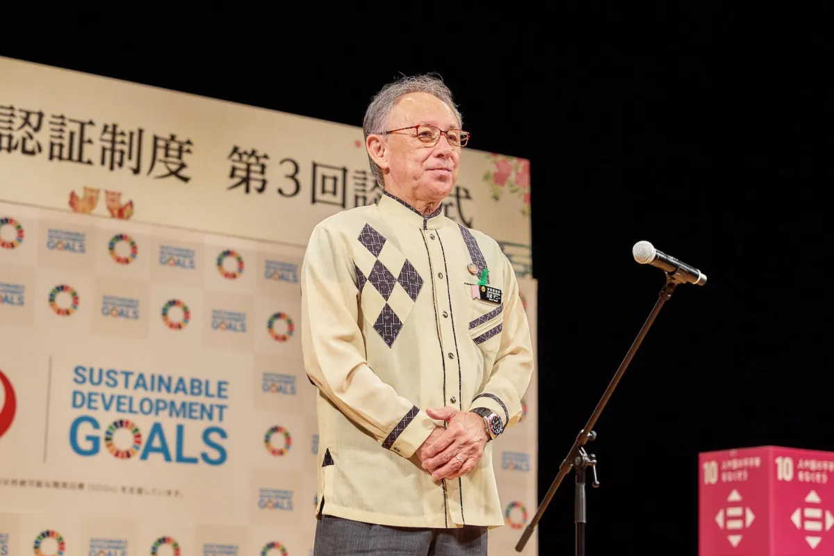 式典の冒頭では、玉城デニー沖縄県知事が挨拶を行い、その後に新たに認証された8団体へ認証書が授与されました。知事は、これまでにSDGsを実践してきた企業や団体に対する敬意と感謝の意を表し、現在の社会は複雑な課題を抱えていることを指摘。それゆえ、行政と企業・団体が連携し、持続可能な沖縄の未来を共に築くことが重要であると強調しました。