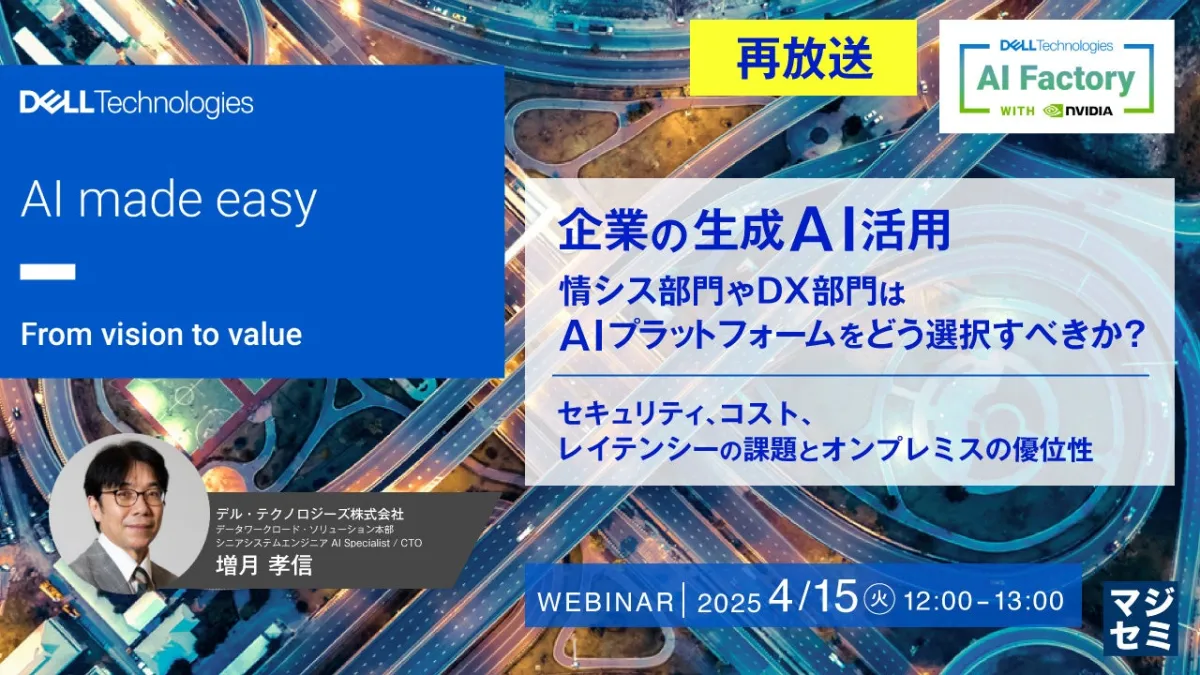 今後の生成AI活用に向けて、情報システムやDX部門がどのようにプラットフォームを選定するべきかを考える必要があります。このような観点から、オンプレミスの優位性をいかに活かすかが重要です。このセミナーでは、これらの課題を克服するための具体的な戦略が提示され、特に「Dell AI Factory with NVIDIA」についても紹介します。