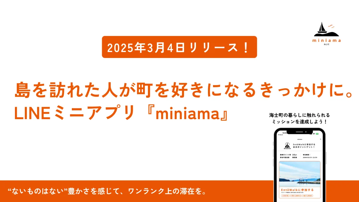 2025年3月4日にリリースされた「miniama」は、島根県海士町において、訪問者と地域の関係性を深めることを目的としたアプリです。このアプリは、LINEミニアプリを活用しているため、LINEのアカウントを持っている方なら誰でも簡単に利用することができます。