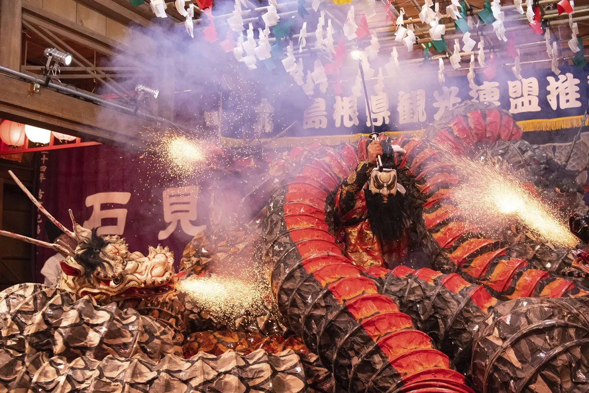 石見地域は、日本神話を題材にした「石見神楽」という伝統芸能が長い歴史を持ち、時代と共に進化を続けています。大蛇が火や煙を吐く迫力ある演出は一見の価値があります。また、神楽が行われる神社は、地域に根付いており、大田市や江津市では夜神楽の公演も行われています。