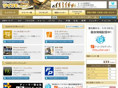 - - 登録ツイッタータイムライン:ツイコモに登録されたツイッターの情報をカテゴリごとに表示し、タブで切り替えることが可能です。各ツイートにはクリックできるタイトルや画像が用意されており、これをクリックすると詳細情報にアクセスできます。