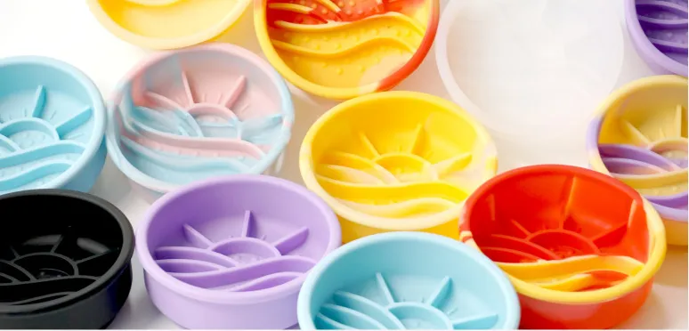 「SILIKING」はプラチナシリコンを100%使用したペット用のスローフィーダーで、安全性が非常に高く、様々な色のバリエーションが魅力です。内側には様々な形状の突起が施されており、ペットが食事をする際に意図的に時間をかけることを促し、早食いや誤飲を防止する役割を果たします。この設計により、愛犬や愛猫の食事がより安全で楽しいものとなります。