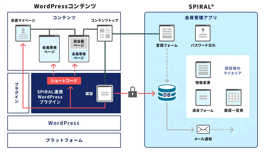 スパイラルが提供する「SPIRAL」は、データベースやWebフォームなど600以上の豊富な機能を兼ね備えており、ユーザーのニーズに沿ったWebアプリケーションをセキュアな環境で構築することが可能です。WordPressとの連携により、個人情報を安全に管理することができ、セキュアな会員サイトも構築できます。