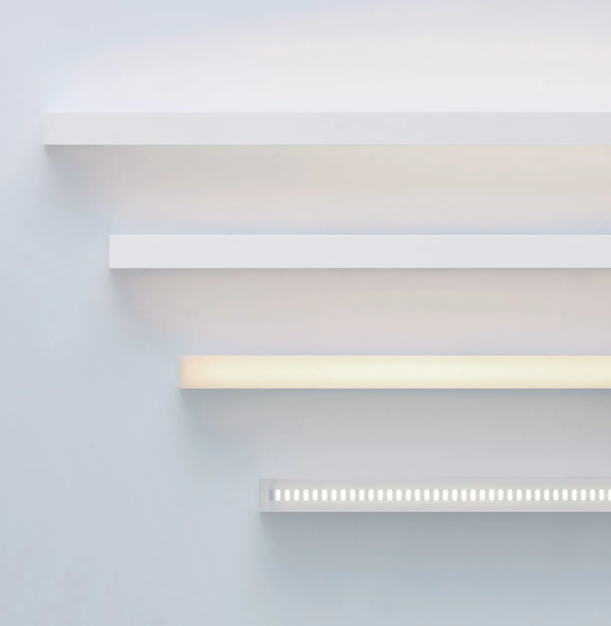 この新しいラインライトは、シンプルな直線的デザインを採用しており、本体が見える位置に設置しても空間に調和する外観を実現しています。利用者が異なる配光タイプを選べるように、拡散、片面配光、両面配光、集光の4種類を同じ形状・サイズで展開しており、複数のタイプを同じ空間で組み合わせても統一感のある印象を与えます。また、従来のLEDの点発光による光のムラを抑制し、連結した部品間でも美しい光のラインを演出できるよう設計されています。