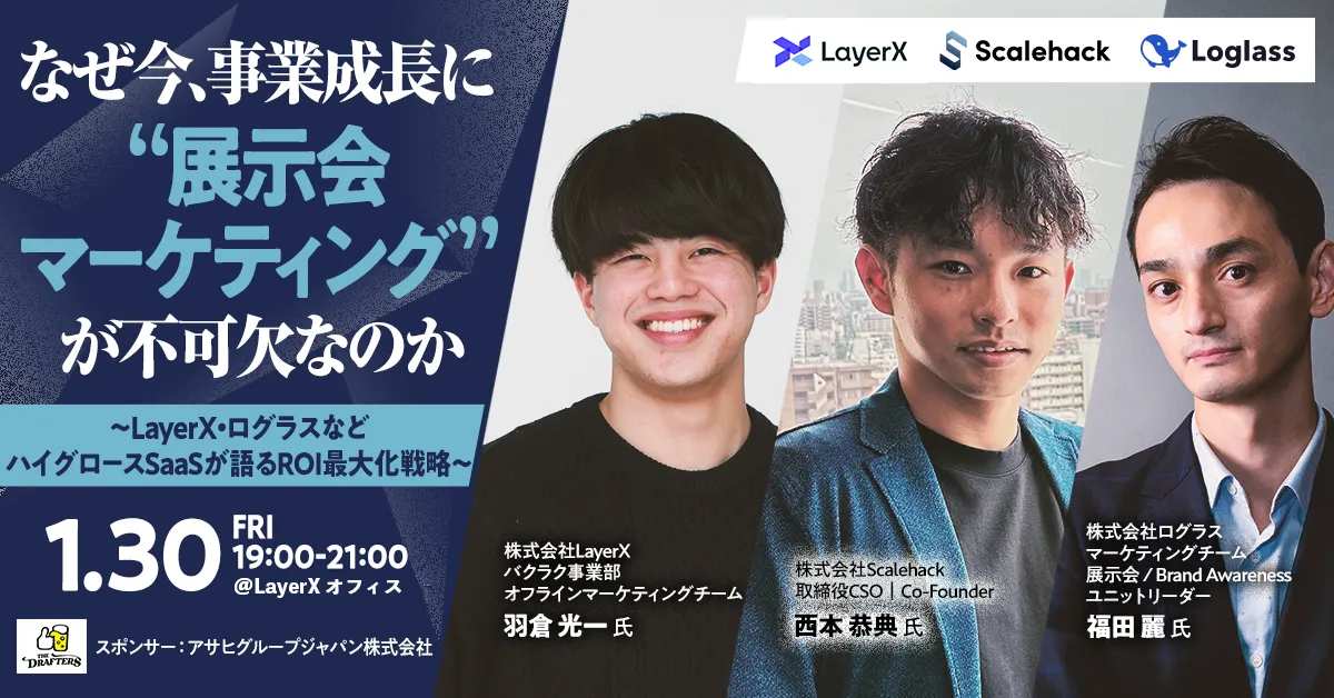 株式会社Scalehackが主催する無料オフラインイベント「なぜ今、事業成長に“展示会マーケティング”が不可欠なのか」が、2026年1月30日(金)の19時より、東京都中央区のLayerX本社にて行われます。このイベントは、展示会を単なる出展から事業成果に直結するマーケティング施策へと再定義することを目的としており、LayerXやログラスとともに、最新のROI最大化の戦略について学ぶ機会となります。