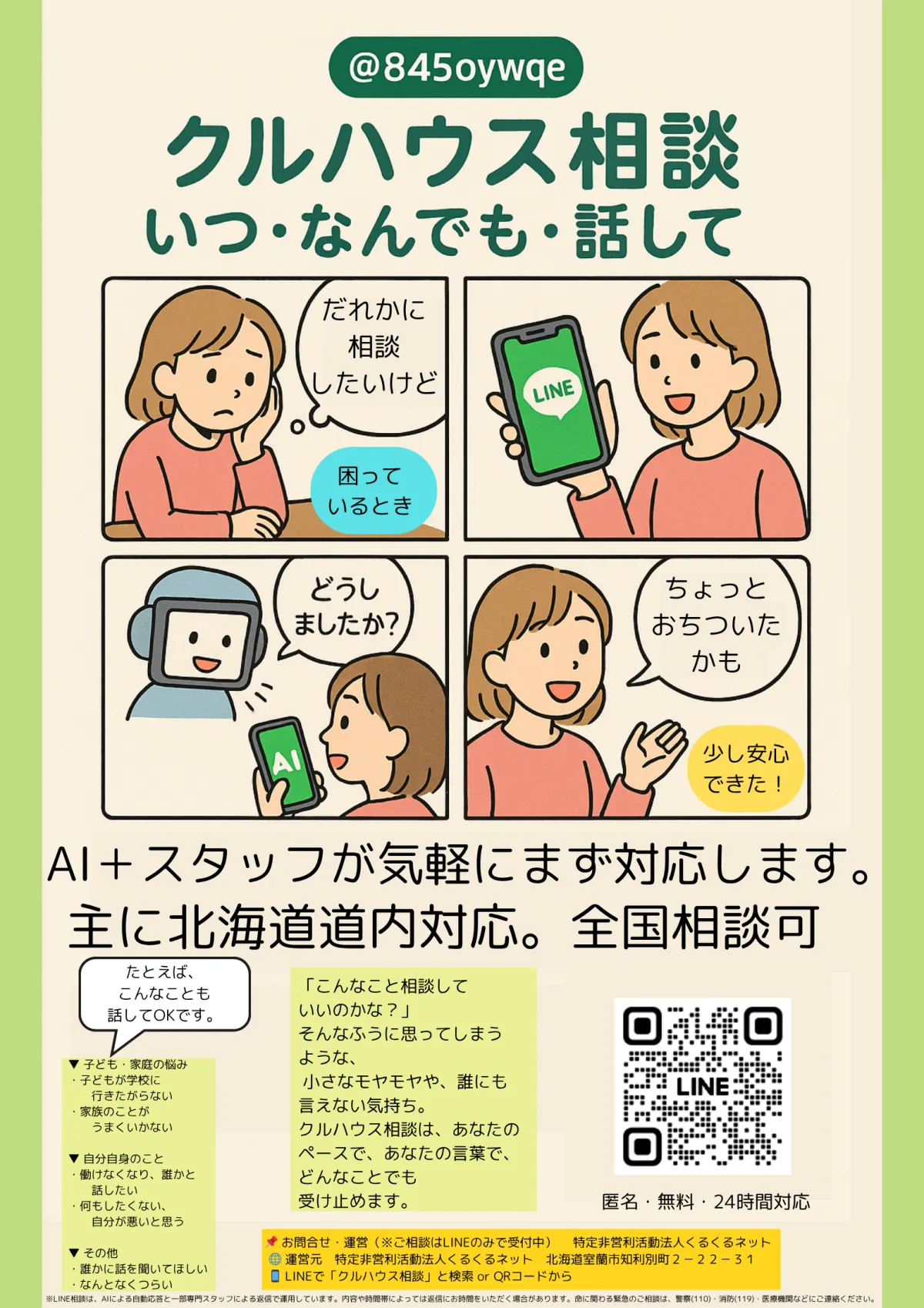 そんな時期に寄り添うためのサービスとして、特定非営利活動法人くるくるネットが提供する「クルハウス相談」があります。これは、LINEを通じて行う24時間対応の相談窓口で、AIと相談員の共同による支援が特徴です。
