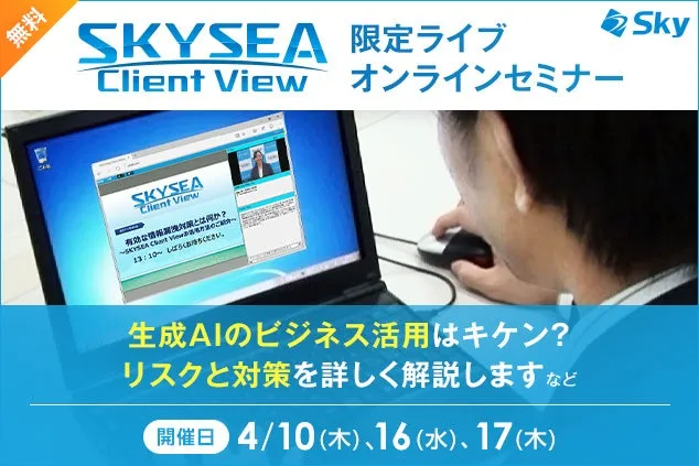近年、生成AIがビジネスの現場でも急速に普及していますが、その増加に伴い、様々なリスクが浮上しています。特に著作権侵害やサイバー攻撃など、ビジネス運用における課題は無視できません。これに伴い、SKY株式会社では「SKYSEA Client View」を利用した情報漏洩対策やIT資産管理についての無料オンラインセミナーを開催しています。