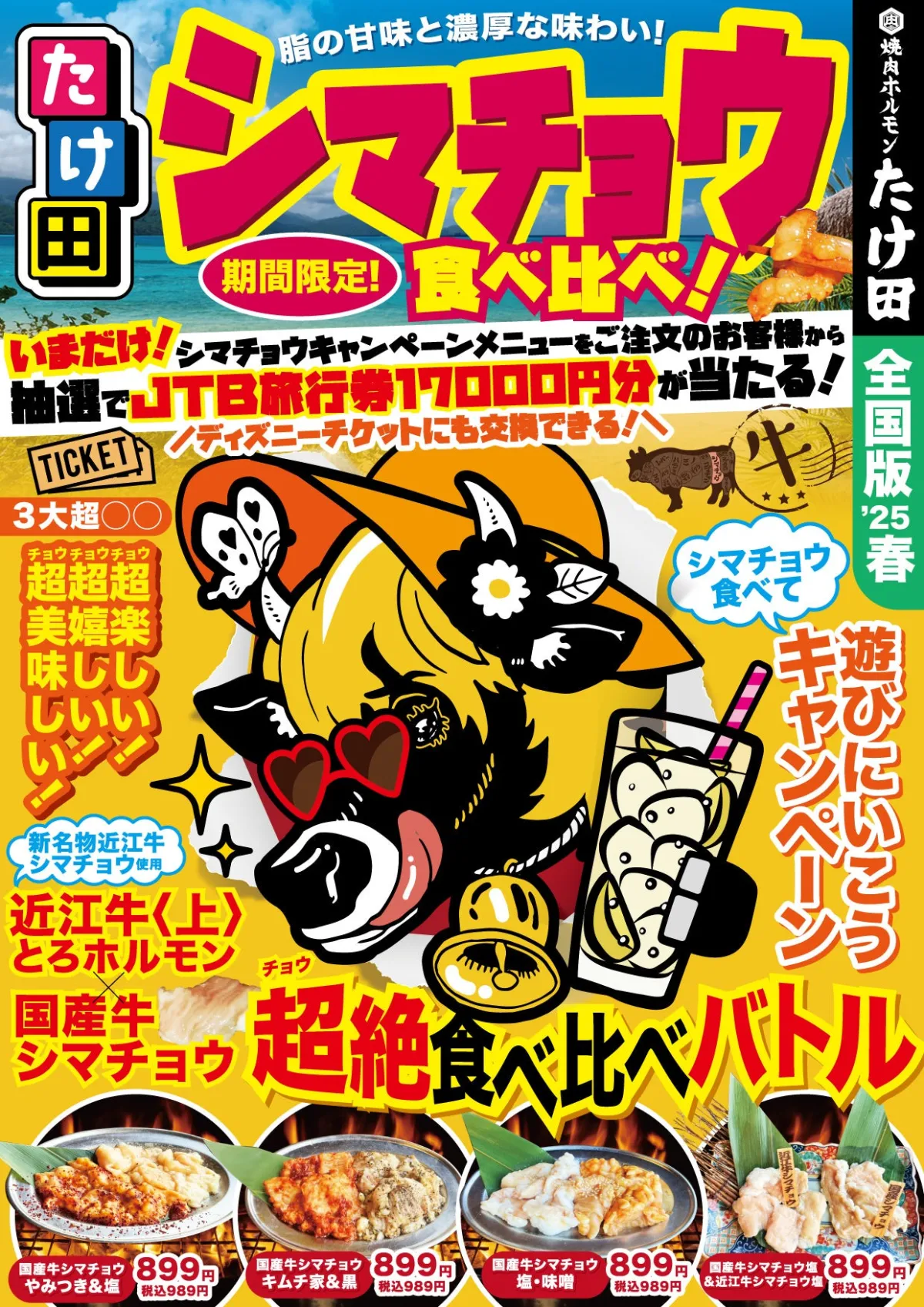 「超」がテーマの楽しいキャンペーン「シマチョウ食べ比べ大会」が、全国の焼肉ホルモンたけ田で開催されています。このイベントでは、新たに登場した名物メニュー「近江牛〈上〉とろホルモン」と「国産牛シマチョウ」を使った贅沢な食べ比べが楽しめます。どちらが“超絶”か、あなた自身で評価することができる、まさに「食べるエンタメ」がここにあります!