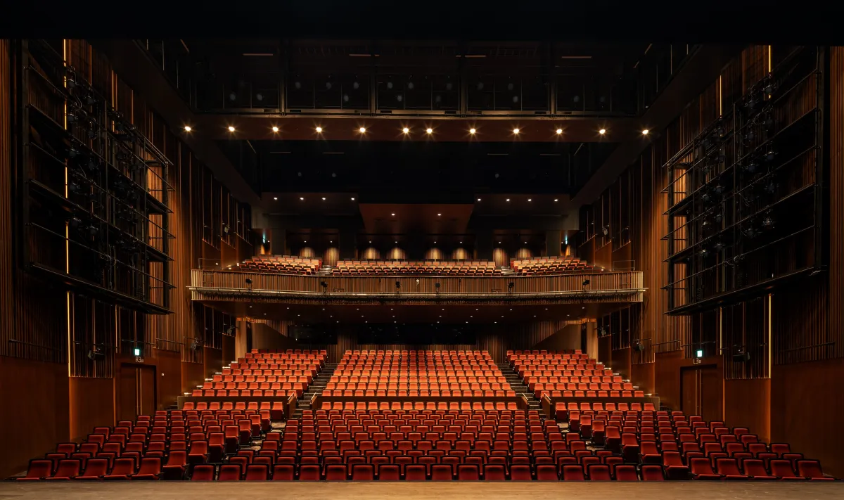 また、当劇場は演劇やミュージカル、音楽ライブなどの催事を主軸に据えており、高さを持たせた段床式の客席配置により、観客は演者の息遣いや胸の高鳴りを間近に感じることができる設計となっています。具体的には1階593席、2階213席の合計806席を完備しており、主舞台面積は約240㎡、耐荷重は700kg/㎡となっています。