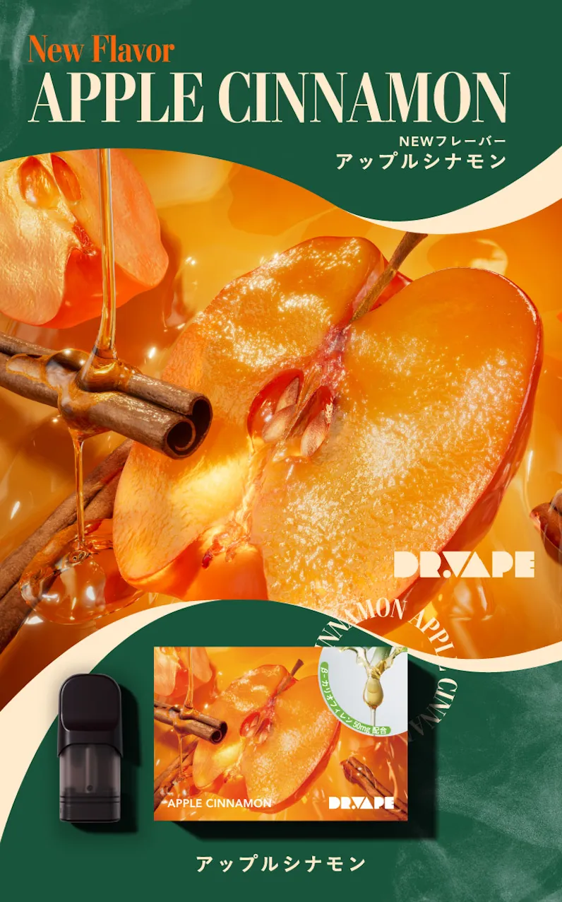 株式会社ロックビルが製造・販売している吸引型ウェルネスデバイス「DR.VAPE」から、冬にぴったりの新フレーバー、「アップルシナモン」が発売されました。このフレーバーは、煮詰めたリンゴの豊かな甘さと、シナモンのスパイシーさが絶妙に組み合わさっており、寒い季節にぴったりのアロマをお届けします。