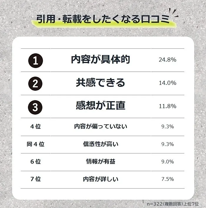 引用・転載されたい口コミには明確な特徴があります。ランキング形式でそのポイントを見てみましょう。