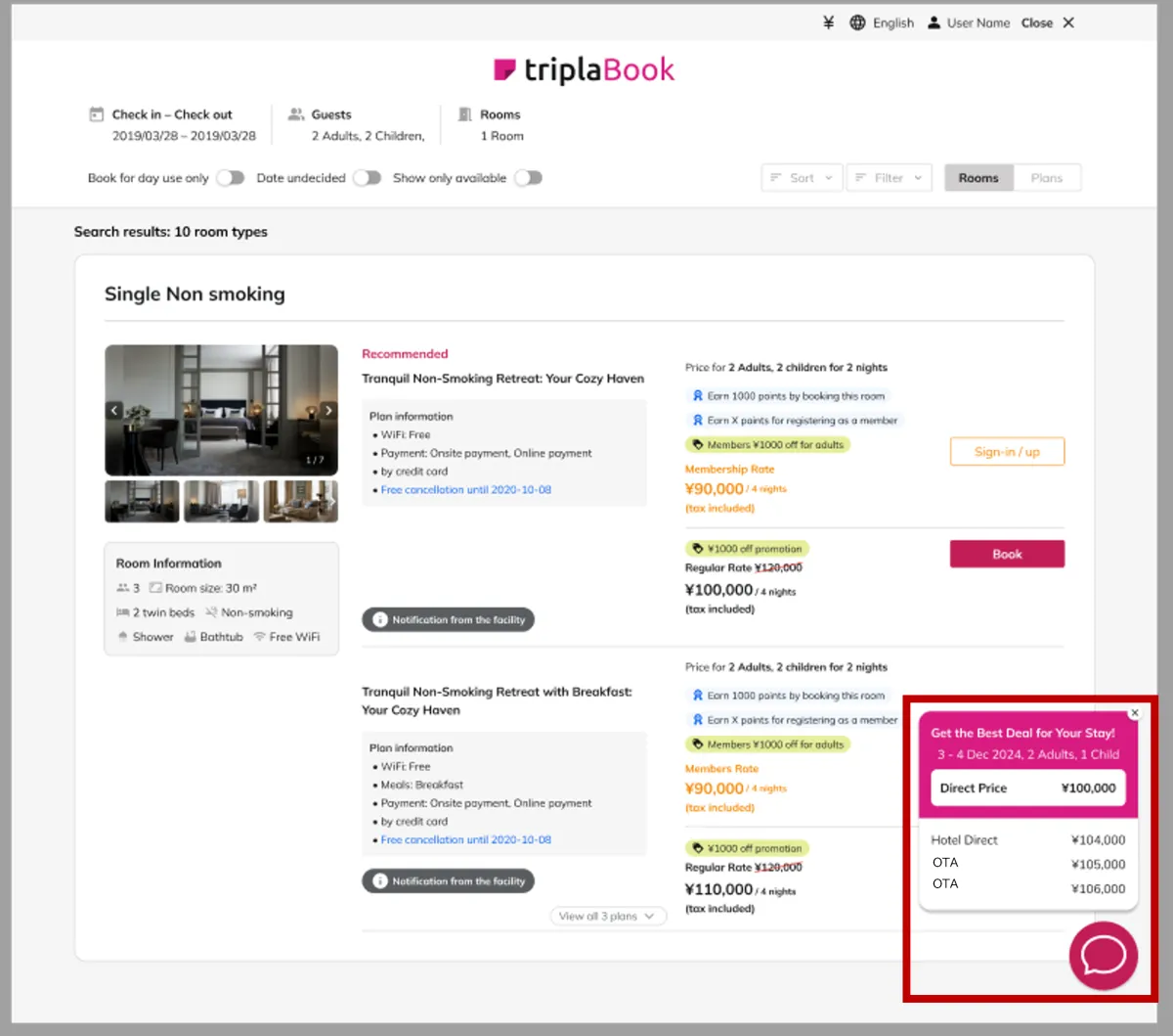 今回の機能追加によって、公式サイトに訪れた顧客はチャットボットの吹き出しから自社とOTAの価格を即座に比較でき、自社の価格を最安値に設定することで予約への導線が強化されます。これにより、宿泊施設は自社の予約比率を向上させる新たなチャンスを得ることができるのです。