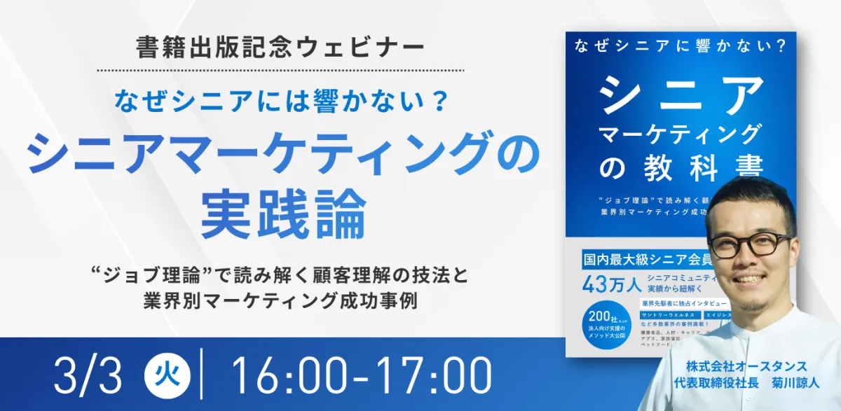 シニア世代に向けたビジネスに携わる方々にとって、シニアマーケティングは避けて通れない重要なテーマです。しかし、その一方で「シニアに響かない」という声も多く聞かれます。この課題を解決するために、国内最大級のシニア向けコミュニティサービス『趣味人倶楽部』を運営する株式会社オースタンスが、特別ウェビナーを開催します。