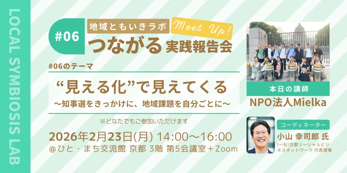 「地域ともいきラボ」が提供する実践報告会「“見える化”で見えてくる~知事選をきっかけに、地域課題を自分ごとに~」が、2026年2月23日、祝日の月曜日に行われます。メインゲストとして、大学生主体のNPO法人Mielkaを迎え、若者と政治をテーマに地域の未来を考える貴重な機会になります。