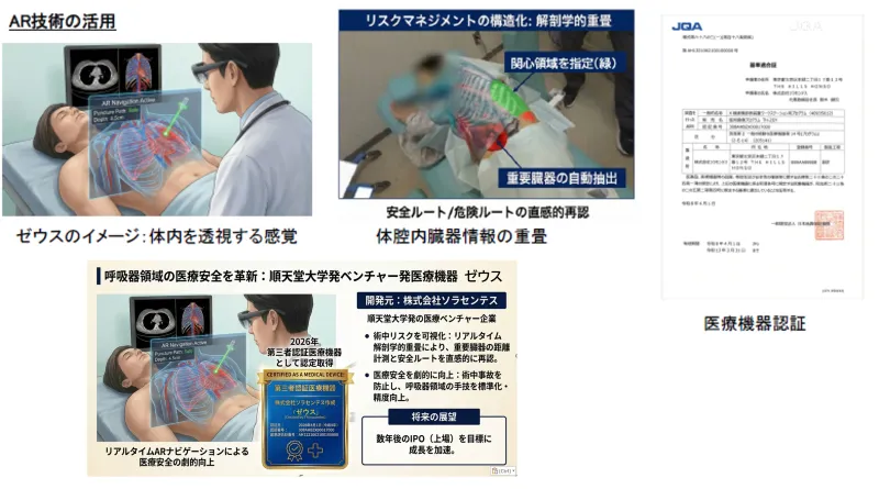 ソラセンテスは、胸腔ドレナージ手技の安全性を向上させるために拡張現実(AR)の技術を医療に導入したいと考えました。このプロジェクトの先導者である鈴木健司教授は、順天堂大学附属順天堂医院の呼吸器外科を担い、胸腔ドレナージに伴う重篤な事故を減少させるために、さらなる研究と開発を行ってきました。鈴木教授は、この技術を実用化するために2023年2月に株式会社ソラセンテスを設立したのです。