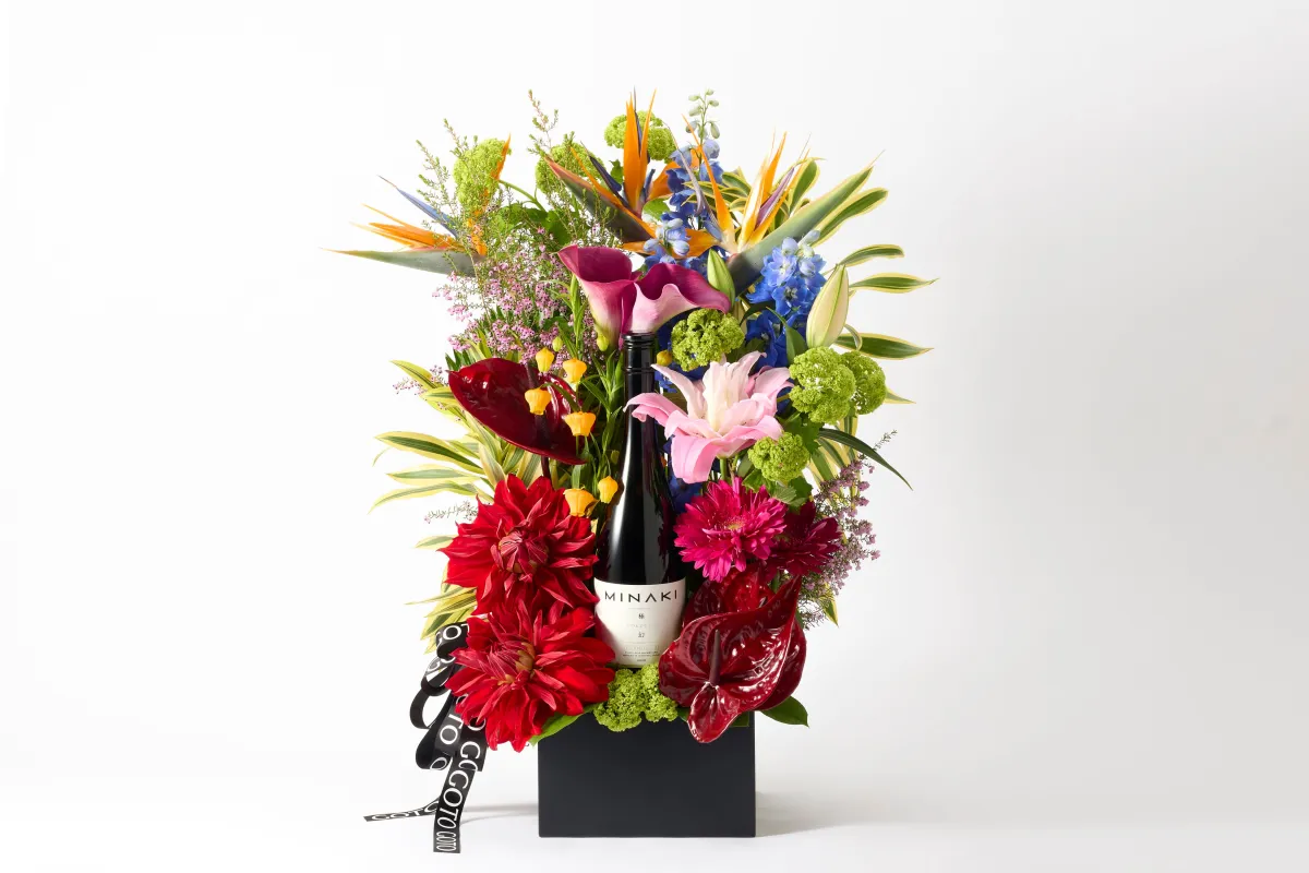 赤、青、オレンジ、ピンクの色合いが調和するこのアレンジメントは、まさに母の強さと優しさを象徴しています。また、マットブラックのボックスに収められた日本酒は、贈り物に一層の重みを与えます。