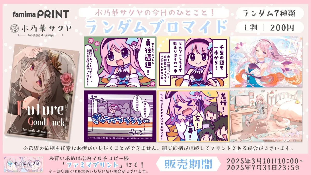 この新しいVTuberブロマイドサービスで、あなたの日常に少しの楽しみを加えてみませんか?木乃華サクヤとともに、素敵なひとことを手に入れるチャンスをお見逃しなく!
