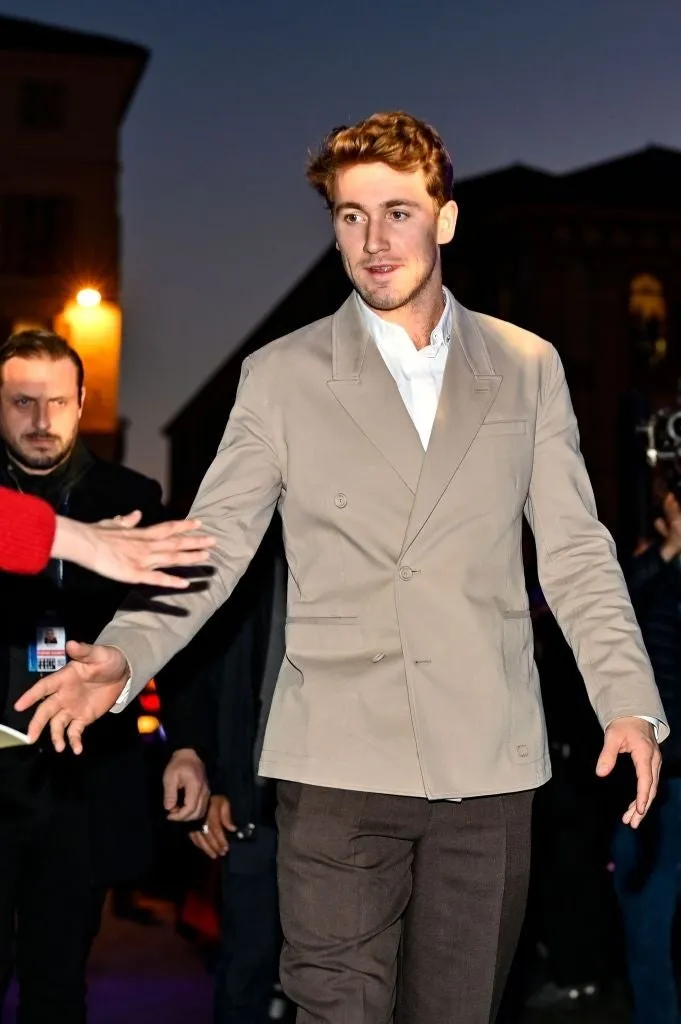ベージュのウールピークドラペルダブルブレストジャケットは、ルードの肩幅を強調し、力強い印象を与えます。クラシックなホワイトコットンシャツとの組み合わせは、上品さを際立たせ、さらにブラウンのウールパンツが、ルードのすらりと伸びた脚を強調。全体のバランスがとれた洗練されたスタイルとなっています。