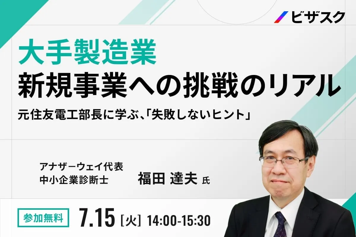 7月15日(火)14:00より、株式会社ビザスクが主催する無料オンラインセミナー「大手製造業 新規事業への挑戦のリアル」が開催されます。今回のセミナーは、アナザーウェイ代表の福田達夫氏を招いて、製造業における新規事業の具体的な取り組みやリアルな課題に迫ります。