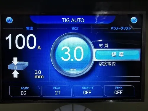 「WT-TIG320S」の最大の特徴は、AUTO機能を搭載していることです。材質(アルミ/ステンレス/軟鋼他)と母材の厚みを設定するだけで、溶接が可能です。材質や厚みに応じて適正電流がプログラムされているため、職人の経験に頼ることなく、誰でも簡単に最適な設定を行うことができます。