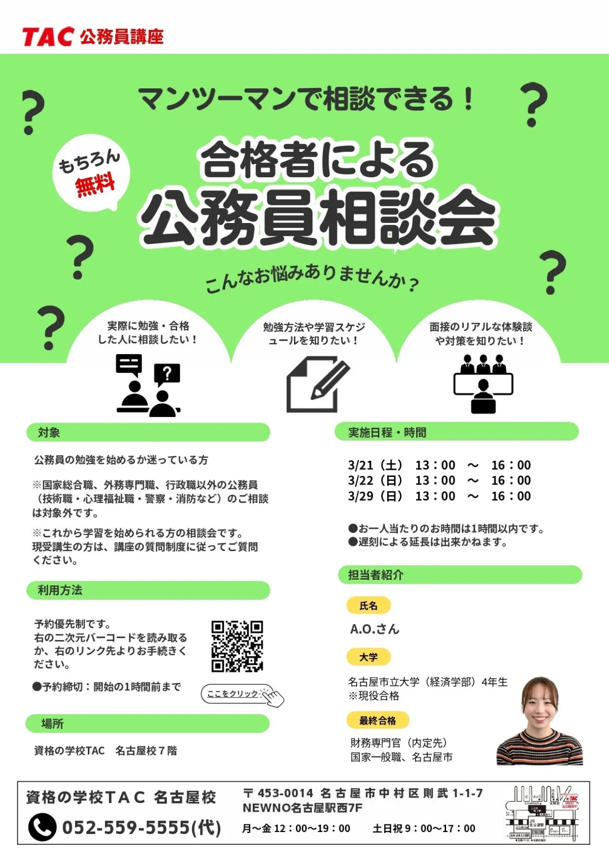 TAC名古屋校の受付時間は、月曜日から金曜日は午後12時から午後7時まで、土日祝日は午前9時から午後5時までです。電話での問い合わせも可能で、052-559-5555からご連絡ください。英語が堪能でない方も、日本語でお気軽に相談ください。