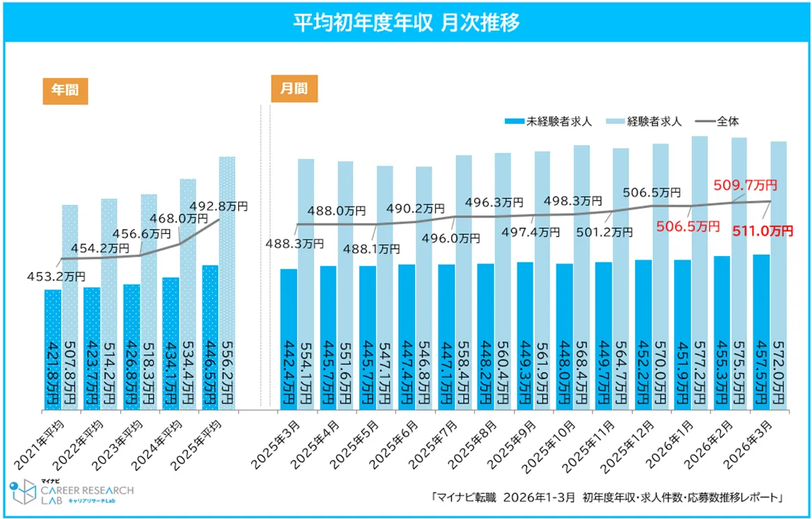 株式会社マイナビが運営する総合転職情報サイト『マイナビ転職』は、2026年1-3月における正社員の平均初年度年収と求人動向について詳細な報告を行いました。この調査は、当サイトに掲載された正社員の求人から得られたデータを基にしています。