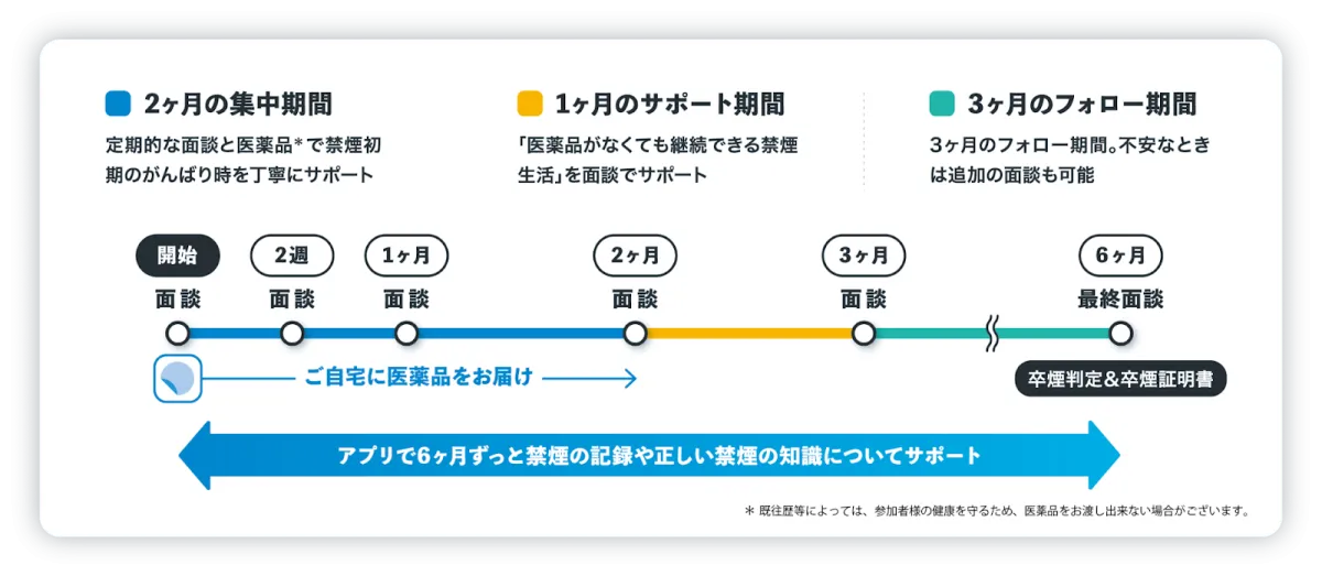「ascure卒煙」は、患者の健康を向上させるための完全オンラインプログラムです。医師によって開発されたアプリと、専門知識を持つ指導員とのマンツーマンのオンライン面談を組み合わせ、禁煙を支援します。プログラム中は、自宅へ禁煙補助薬が配送され、身体的な支援も受けることができます。