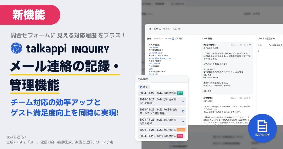 株式会社アクティバリューズが展開する「talkappi」は、宿泊施設向けのオールインワンホスピタリティクラウドとして、宿泊や観光に関連する多様なサービスを提供しています。そんな中、特に注目される新機能「メール連絡の記録・管理機能」が、2025年7月25日から本格提供を始めるというニュースが発表されました。これにより、宿泊施設の問い合わせ対応がいかに進化するのでしょうか。
