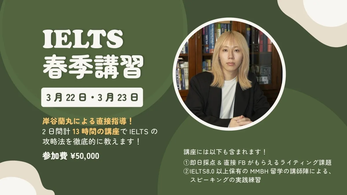 MMBH留学は、2025年3月22日と23日の2日間にわたり、代表の岸谷蘭丸によるIELTS春季講習を東京都内で開催します。この講習では13時間の集中講義が行われ、参加者はテスト力をアップさせるための具体的な方法を学ぶことができます。参加費用は50,000円で、この料金には事前課題や当日課題のライティング添削、さらにIELTS8.0以上を保有する講師陣によるスピーキング練習も含まれます。また、岸谷からの直接フィードバックも受けられ、実践的な内容が期待できます。