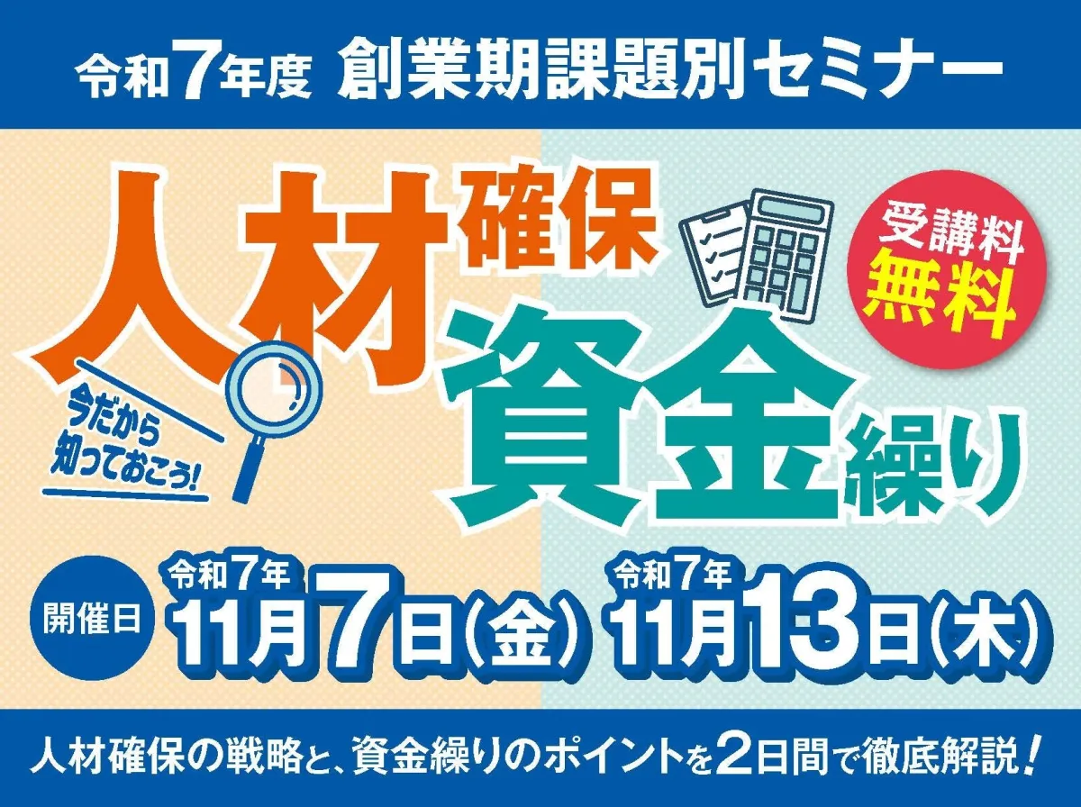 本セミナーでは、特に創業期に直面することが多い「人材確保の戦略」と「資金繰り」の知識を深く掘り下げて学ぶことができます。資金難や人材不足といった厳しい環境下で、どのように経営を上手く進めていくかの具体的な方策を知ることができるでしょう。
