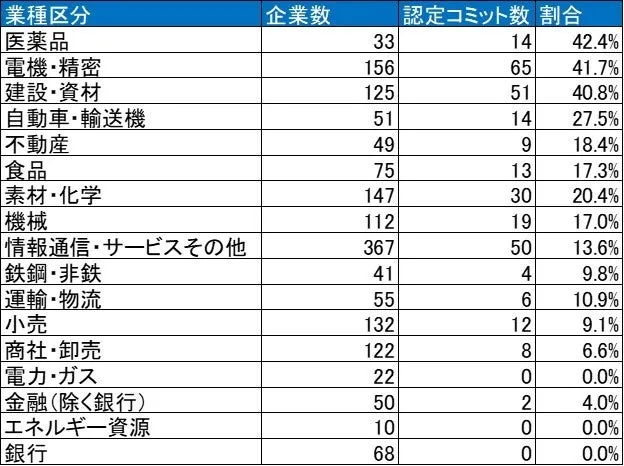 業種別に見てみると、医薬品業界は42.4%、電機・精密業界が41.7%、建設・資材業界が40.8%という具合に、SBT認定の取得が進んでいることが分かります。一方で、商社・卸売や金融業界、さらには電力・ガスセクターに至っては、取り組みが非常に遅れている現状が浮き彫りとなっています。
