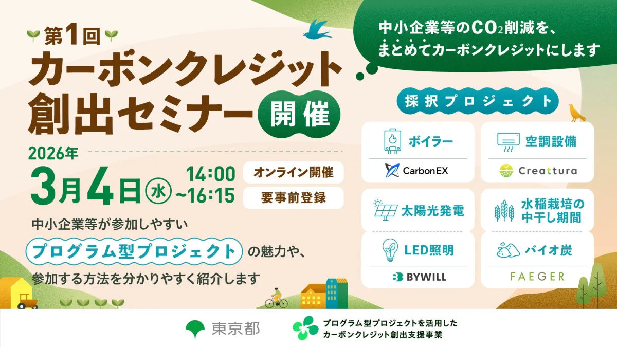 2023年3月4日、Carbon EX株式会社が東京都主催の「第1回カーボンクレジット創出セミナー」にオンラインで参加し、Co-CEOの陰山が登壇しました。本セミナーは、東京都が推進する「プログラム型プロジェクトを活用したカーボンクレジット創出支援事業」の一環であり、中小企業が省エネや設備更新を通じて、いかにカーボンクレジットを創出できるかをテーマに実務的な視点から解説が行われました。