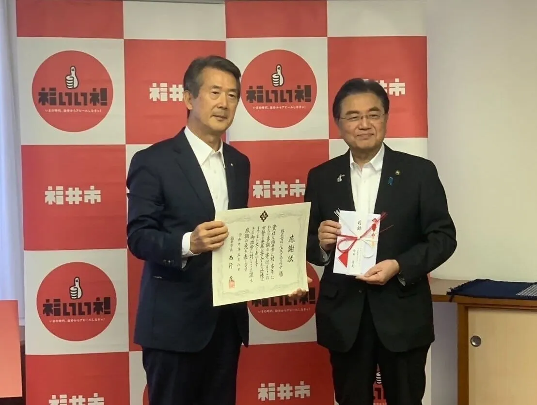 令和7年5月8日に行われた感謝状贈呈式には、株式会社ジェスクホリウチの今井秀夫社長が出席し、西行茂福井市長から感謝の意を表されました。この瞬間は、地域への深い思いを持つ企業と、その支援を受ける市との強い絆を象徴しています。今井社長は「地域の発展に寄与したい」という意気込みを示し、西行市長は「地域の未来を支える貢献に深く感謝します」と述べました。