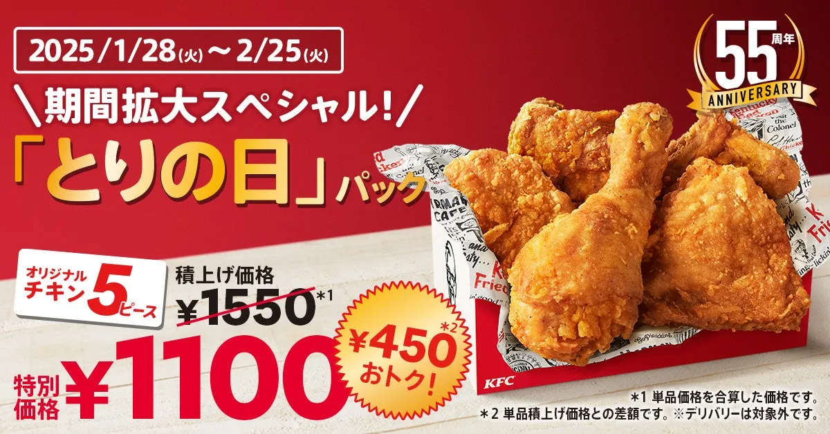 ケンタッキーフライドチキン(KFC)が、2025年1月28日から2月25日までの間、日本上陸55周年を記念して特別な「とりの日パック」を販売します。このパックは通常の「にわとりの日」の特典を大幅に拡大し、約4週間の間、お得にオリジナルチキンを楽しむことができます。
