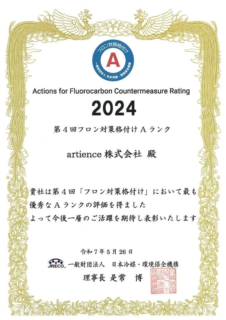 artience株式会社(東京・中央区)は、一般財団法人日本冷媒・環境保全機構(JRECO)が評価する「第4回 JRECOフロン対策格付け」において、2年連続でAランク評価を獲得したことを発表しました。これは、同社のフロン類に関する適切な管理と啓発活動が高く評価された結果です。