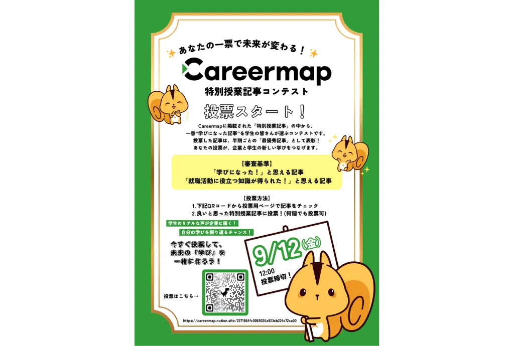 記事を読んで、実際に「学びになった」「就職活動に役立ちそう」と感じたものに投票してください。あなたの一票が、これから学ぶ仲間や後輩の未来を切り開く大きな力となります。