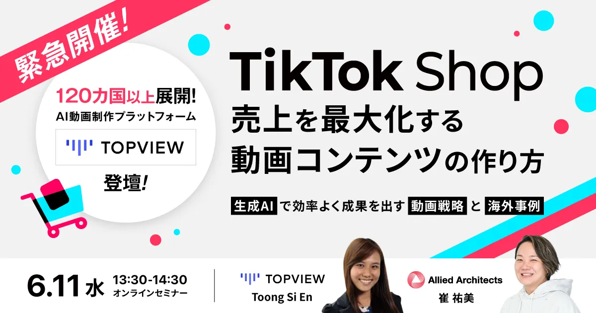 2025年にローンチ予定の TikTok Shop は、ショート動画や LIVE 配信を活用して視聴者が即商品を購入できる新しい形の e コマース機能です。アライドアーキテクツ株式会社(東京都渋谷区)は、TikTok Shop の先進国であるシンガポールの AI 動画制作プラットフォーム「Topview AI」との共催により、6 月 11 日(水)に無料オンラインセミナー「TikTok Shopで売上を最大化する『売れる動画コンテンツ』のつくり方」を開催します。このセミナーでは、特に重要な「購買につながるショート動画」の質と量について学ぶことができます。