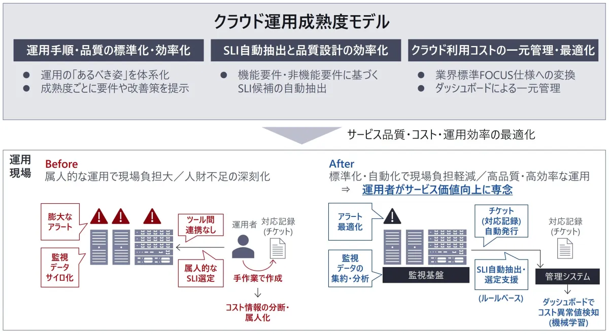 日立製作所は、ITサービス運用における現場の負担軽減と人材不足解決を目指し、クラウド運用成熟度モデルを新たに開発しました。このモデルは、日々の業務に追われる運用者が、より一層サービスの価値向上に注力できるよう支援することを目的としています。従来の手法では、運用の品質管理やクラウド利用コストの管理が担当者の主観に依存してしまうため、多大な労力を要していました。しかし、このモデルを活用することで、運用業務の効率化と標準化が実現されます。
