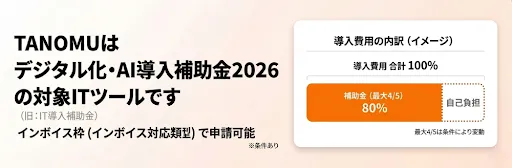 この補助金制度は、中小企業や小規模事業者の労働生産性向上を目的としたもので、デジタル化やDX推進に向けたAIを含んだITツールの導入を支援します。タノムが登録した「インボイス枠」は、生産性向上への取り組みを後押しする制度で、通常の補助率を上回る支援が受けられることも注目です。