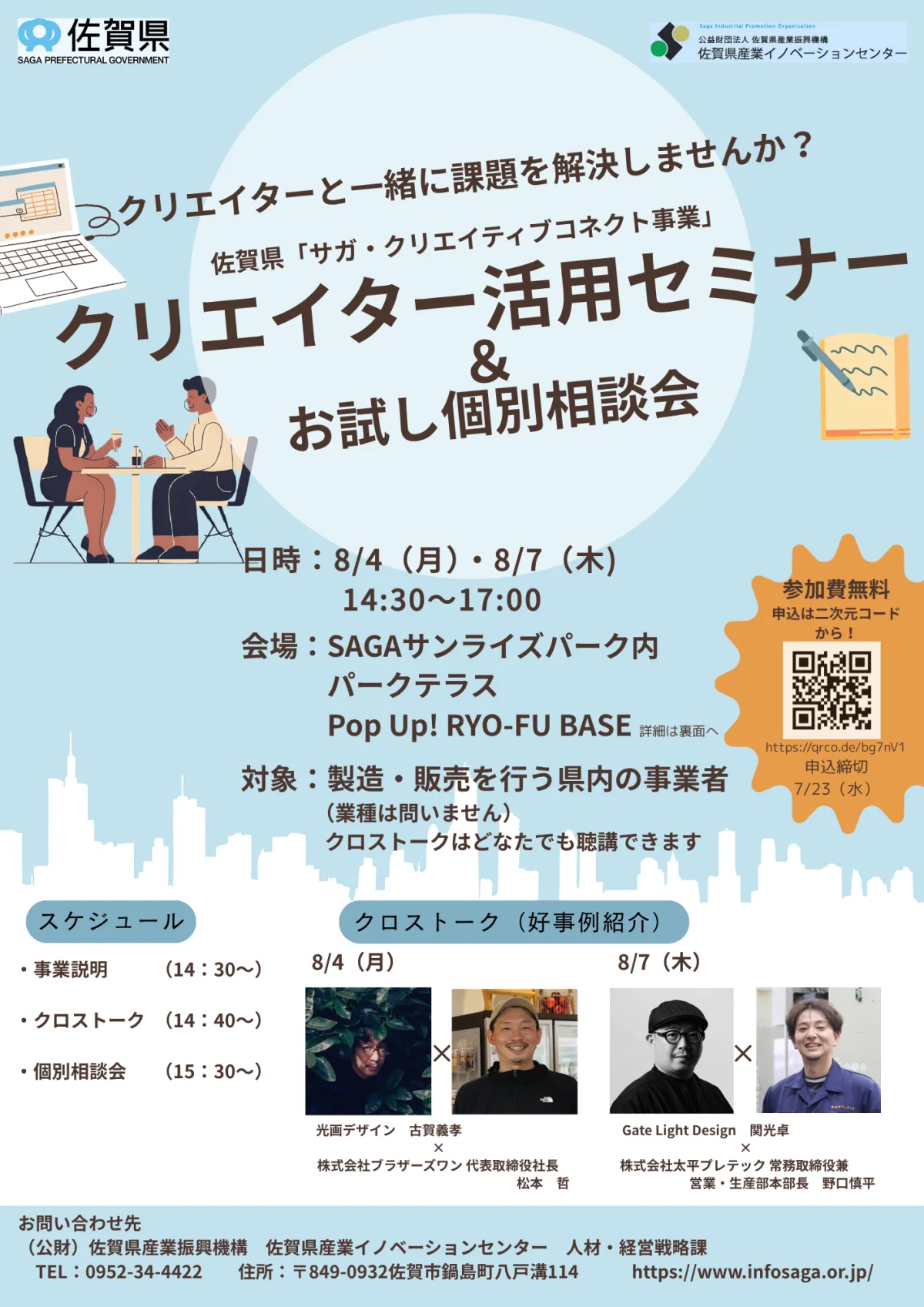 佐賀県産業イノベーションセンターでは、地域の中小企業の経営課題を解決するために、さまざまな支援を行っています。この度、新たな試みとして、クリエイターとの連携をテーマにしたセミナーとお試しの個別相談会を開催することとなりました。本セミナーは、クリエイターがどのように企業の課題を解決し、価値を向上させるかを学ぶ絶好の機会です。